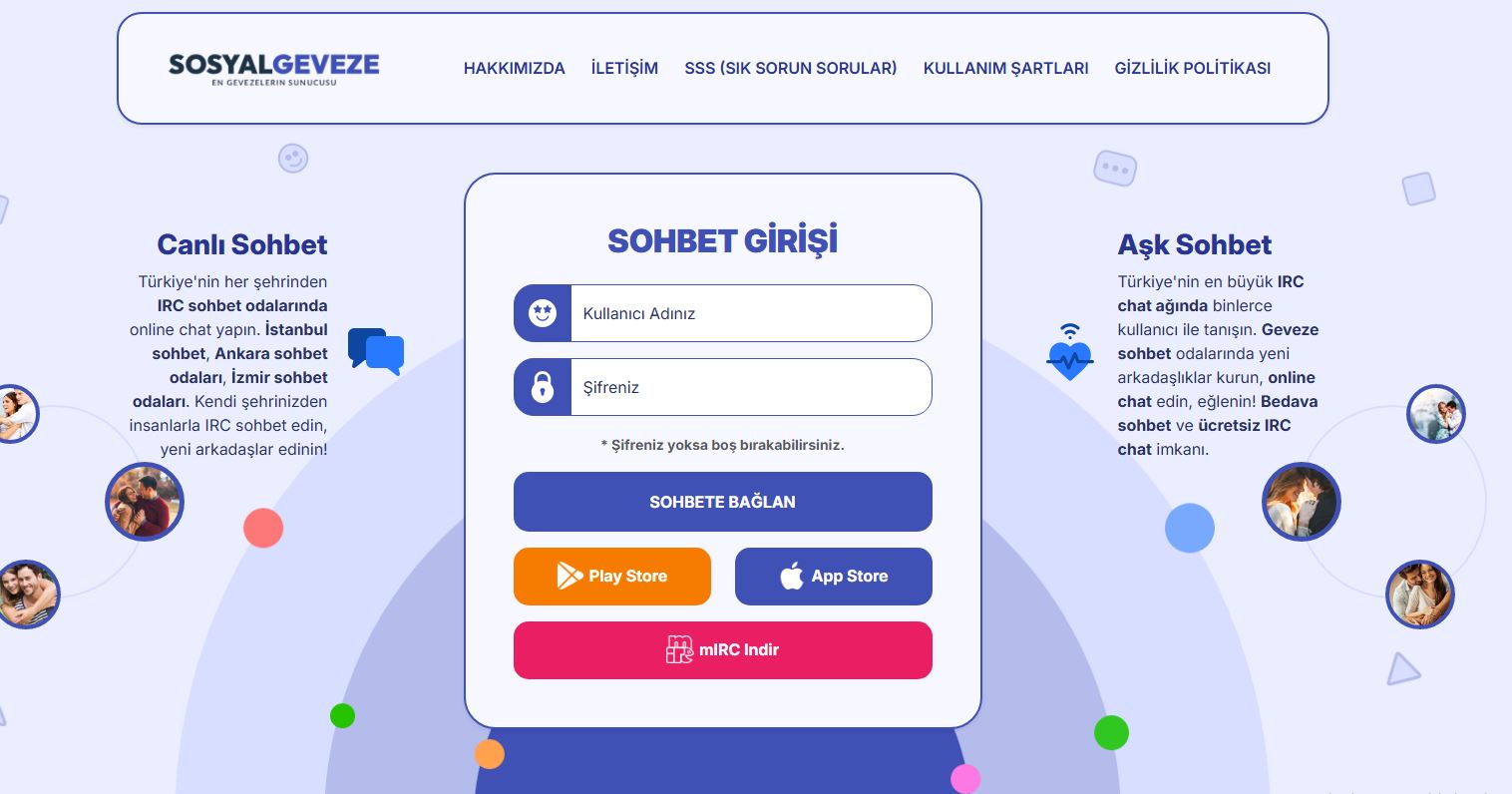 Türkiye’de IRC sohbet kültürü yıllardır internet kullanıcılarının vazgeçilmezi olmuştur. Geveze Chat ve Kalbim IRC, bu kültürü modern tasarımla birleştirerek SosyalGeveze.Com kullanıcılarına eğlenceli ve güvenli sohbet ortamı sunuyor.